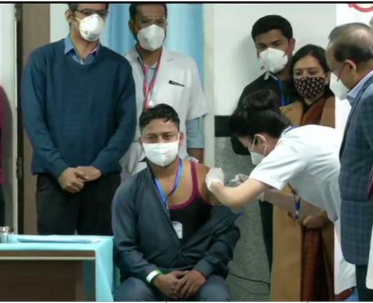 இந்தியாவின் முதல் கொரோனா தடுப்பூசியை பெற்ற துப்புரவு பணியாளர்