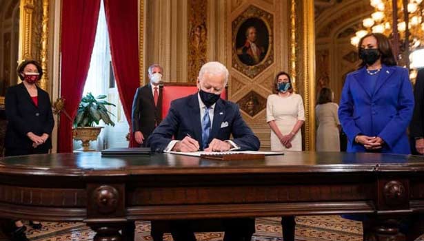 இதையடுத்து வெள்ளை மாளிகையில் தனது பணிகளை ஜோ பைடன் தொடங்கினார். அமெரிக்க அதிபர் ஜோ பைடன் பதவியேற்ற சில நிமிடங்களிலேயே தனது பதவிக் காலத்தின் முதல் அரசாங்க ஆவணங்களில் கையெழுத்திட்டார்.