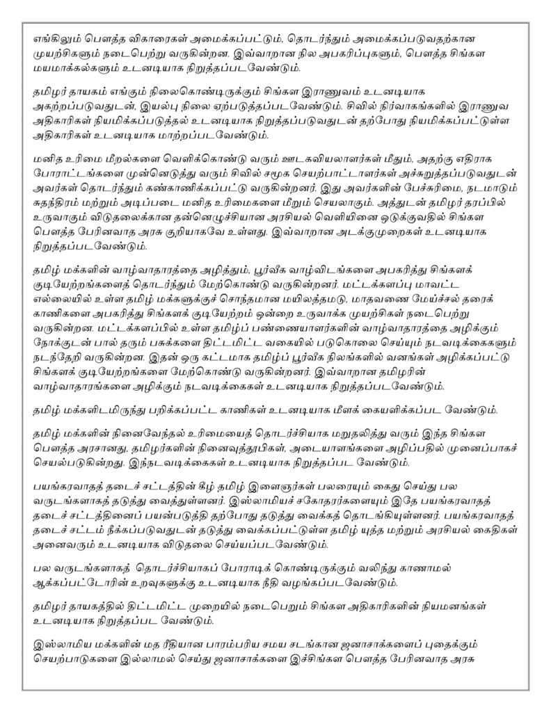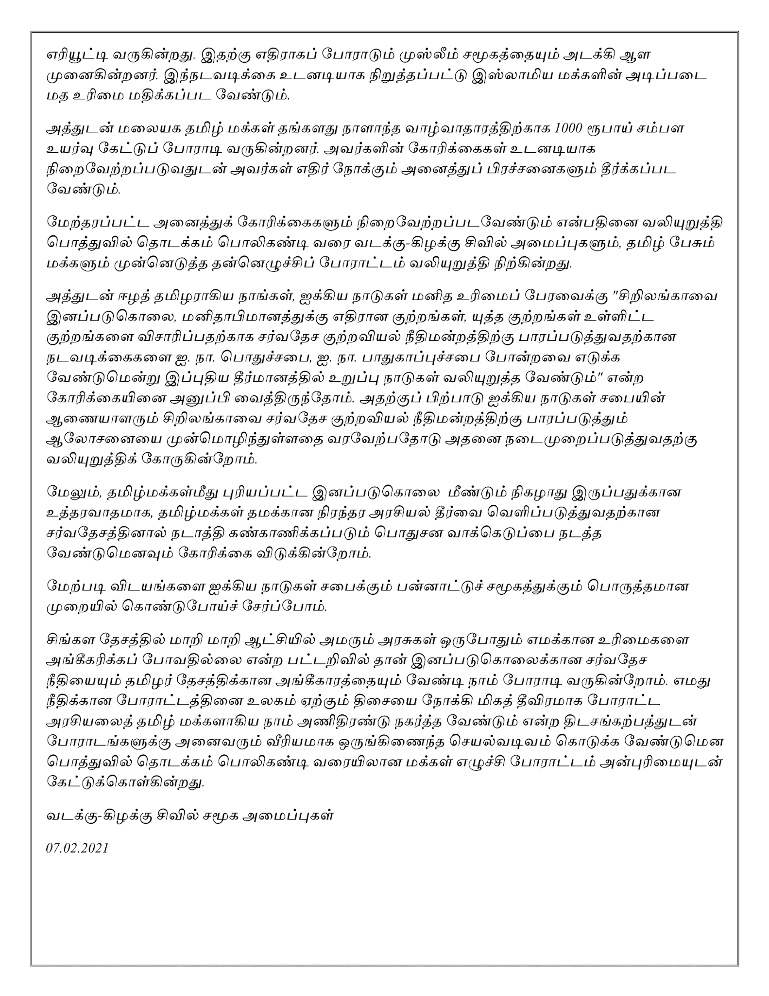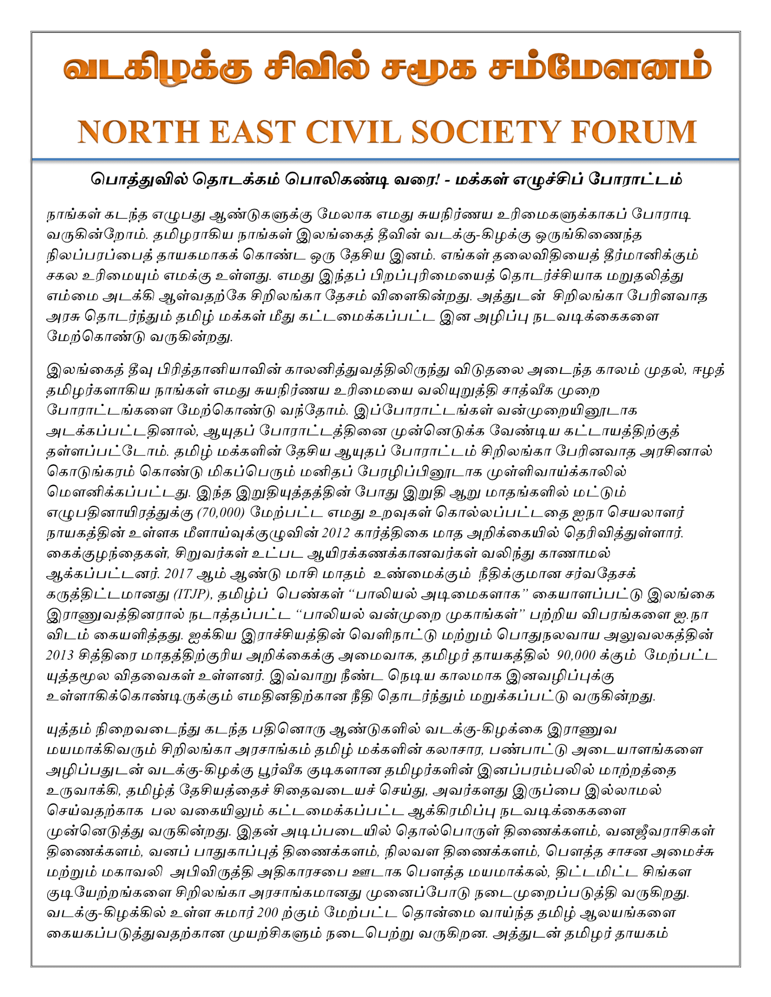 எமது நீதிக்கான போராட்டத்தினை உலகம் ஏற்கும் திசை நோக்கி, மிகத் தீவிரமாக போராட்ட அரசியலை தமிழ் மக்களாகிய நாம் அணிதிரண்டு நகர்த்த வேண்டும்.இந்த திடசங்கற்பத்துடன் போராட்டங்களுக்கு அனைவரும் வீரியமாக, ஒருங்கிணைந்த செயல் வடிவம் கொடுக்க வேண்டும் என பொத்துவில் தொடக்கம் பொலிகண்டி வரையான மக்கள் எழுச்சிப் பேரணி அன்புரிமையுடன் கேட்டுக்கொள்கிறது என வடக்கு – கிழக்கு சிவில் சமூக அமைப்புகள் வெளியிட்டுள்ள இறுதிப்பிரகடனத்தில் தெரிவிக்கப்பட்டது.