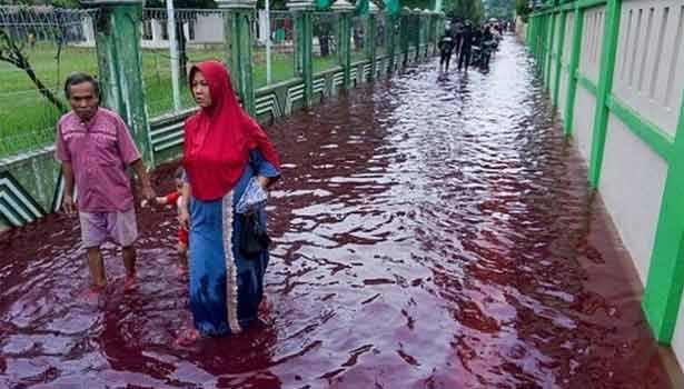 இந்தோனேஷியாவில் உள்ள ஜாவா பகுதியில் ஜெயில் கோட் என்ற இடம் உள்ளது. இங்குள்ள கிராமங்களில் நேற்று ரத்த சிவப்பு நிறத்தில் வெள்ளம் சூழ்ந்தது. இதனால் அங்குள்ள மக்கள் அதிர்ச்சி அடைந்தனர். அந்த வெள்ளத்தை சொல்போனில் படம் பிடித்து சமுக வலைத் தளங்களில் பதிவிட்டனர்.