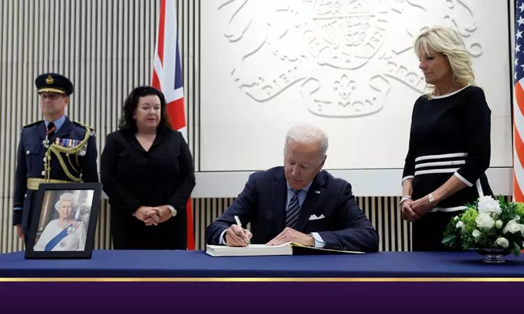 பைடன் மற்றும் அவரது மனைவி ஜில் பைடன் இருவரும் வாஷிங்டன் நகரில் உள்ள இங்கிலாந்து தூதரகத்தில் உள்ள இரங்கல் புத்தகத்தில் கையெழுத்திட்டனர். அதிபர் பைடனிடம் செய்தியாளர்கள், இங்கிலாந்து ராணி 2-வது எலிசபெத்தின் இறுதி சடங்கில் கலந்து கொள்வீர்களா? என கேள்வி எழுப்பியதற்கு ஆம். அடுத்த என்ன என்ற விவரங்கள் எதுவும் எனக்கு தெரியாது. ஆனால் நான் செல்வேன் என பதில் கூறினார். நான் இன்னும் அரசர் சார்லசிடம் பேசவில்லை.