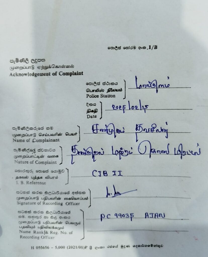 குறித்த சம்பவம் தொடர்பில் மாங்குளம் பொலிஸ் நிலையத்தில் ஊடகவியலாளர் சண்முகம் தவசீலன் , மாங்குளம் பொலிஸ் நிலையத்தில் முறைப்பாடு பதிவு செய்துள்ளார்.