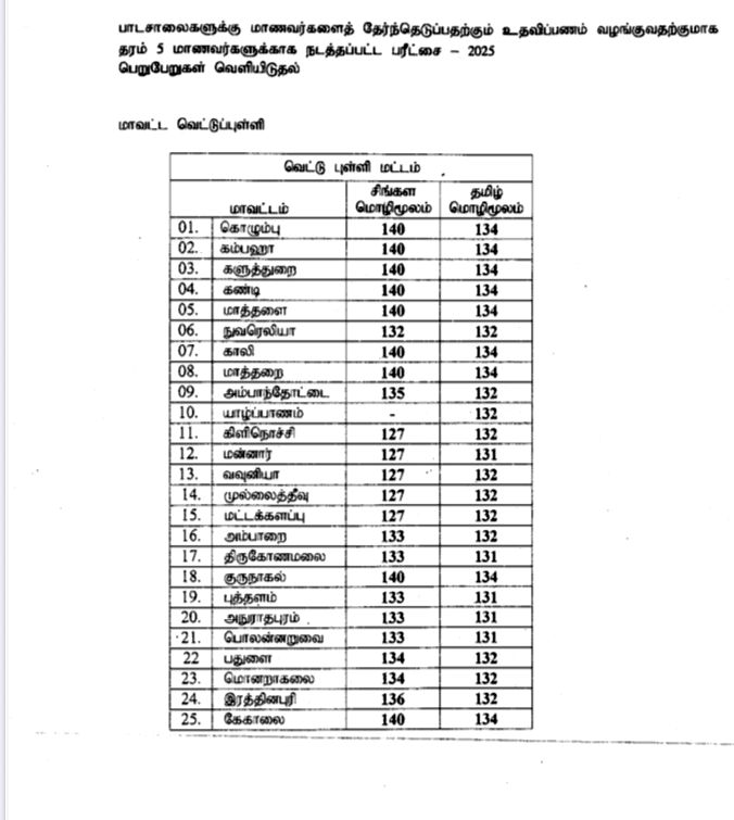2025 புலமைப்பரிசில் பரீட்சை மாவட்ட வாரியான வெட்டுப்புள்ளிகள்