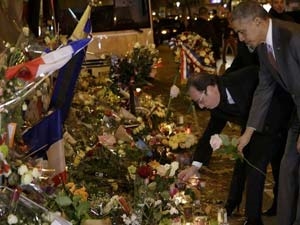 பாரீசில் தீவிரவாதிகள் தாக்கிய இடத்தில் ஒபாமா அஞ்சலி