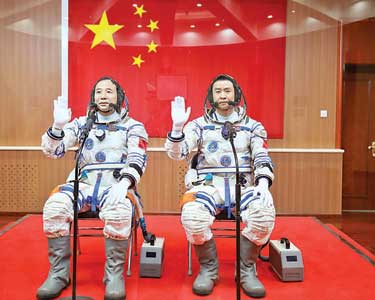 விண்வெளியில் தனக்கென ஒரு நிரந்தர விண்வெளி நிலையத்தை அமைப்பதற்கான கட்டுமானப் பணியை சீனா கடந்த மாதம் தொடங்கியது. இந்த நிலையத்தை 2022-க்குள் கட்டி முடிக்கவும் திட்டமிட்டு இருக்கிறது. இங்கு ஒரு மாதம் தங்கியிருந்து பல்வேறு ஆய்வுகளை மேற்கொள்வதற்காக ஷெங்ஷோவ்-11 (சொர்க்க வாகனம்) என்கிற விண்கலம் மூலம் ஜிங் ஹாய்பெங்க் (வயது 50), சென்டோங் (37 – வலது புறம் இருப்பவர்) ஆகிய 2 வீரர்களை விண்வெளிக்கு சீனா நேற்று அனுப்பி வைத்தது. அவர்கள் இருவரையும் ‘லாங் மார்ச்-2 எப்’ என்ற ராக்கெட் சீனாவின் ஜியூகுவான் செயற்கைகோள் ஏவுதளத்தில் இருந்து வெற்றிகரமாக விண்ணுக்கு சுமந்து சென்றது. விண்வெளிக்கு பயணமான சீன வீரர்கள் இருவரையும் படத்தில் காணலாம்.