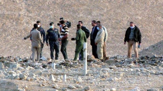 எலும்புத் துண்டுகள் மற்றும் புல்லட் குப்பிகள் அங்குச் சிதறி இருந்தன. மற்றும் அங்குத் தாங்கமுடியாத அளவில் துர்நாற்றம் வீசியது. பெரும்பாலும் ஐ.எஸ்.சிடம் பிடிபட்ட சுமார் 40 பாதுகாப்பு படையினர் அங்கு புதைக்கப்பட்டிருக்கலாம் என உள்ளூர் மக்கள் கூறினார்.