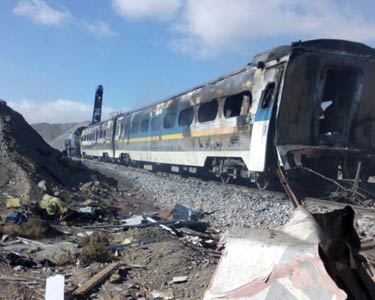 நின்று கொண்டிருந்த அந்த ரெயில் மீது, டாப்ரிஸ் நகரில் இருந்து வந்துகொண்டிருந்த ரெயில் பயங்கரமாக மோதியது. இந்த மோதலை தொடர்ந்து 4 பெட்டிகள் கவிழ்ந்தன. அவற்றில் 2 பெட்டிகள் தீப்பிடித்து எரிந்தன. பயணிகள் மரண ஓலமிட்டு கதறினர்.