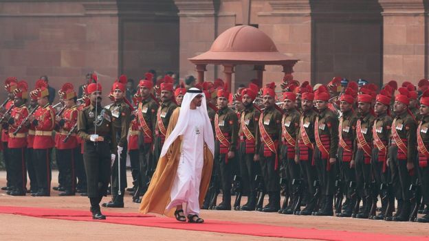 இந்தியத் தலைநகர் தில்லியில் இன்று (வியாழக்கிழமை)நடக்கும் நாட்டின் வருடாந்திர குடியரசு தின அணிவகுப்பில், தலைமை விருந்தினராக கலந்து கொள்ள அபுதாபியின் இளவரசர் முகமது பின் ஜாயித் அல் நஹ்யானுக்கு இந்தியா அழைப்பு விடுத்துள்ளது. வளைகுடா நாடுகளுடன் பொதுவாக நெருக்கமான உறவுகளை பராமரிக்கும் தனது பிராந்திய போட்டியாளரான பாகிஸ்தானுக்கு எதிரான நடவடிக்கையாக இந்திய பிரதமர் நரேந்திர மோதியின் இந்த முயற்சி பார்க்கப்படுகிறது. இந்தியாவின் பழைய கட்டமைப்பை மேம்படுத்தும் பணிக்காக தான் ஏறக்குறைய 75 பில்லியன் டாலர்களை முதலீடு செய்யப் போவதாக ஐக்கிய அரபு அமீரகம் கூறியுள்ளது.