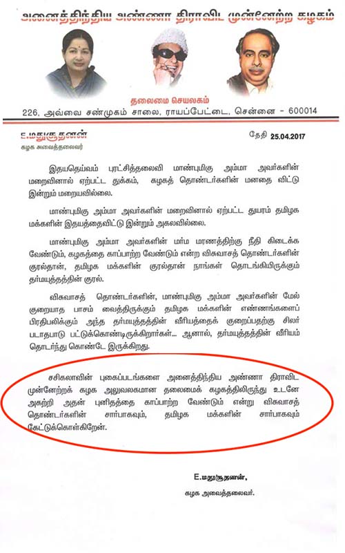 அந்த அறிக்கையில், “சசிகலாவின் புகைப்படங்களை அனைத்திந்திய அண்ணா திராவிட முன்னேற்றக் கழக அலுவலகமான தலைமைக் கழகத்திலிருந்து உடனே அகற்றி அதன் புனிதத்தை காப்பாற்ற வேண்டும் என்று விசுவாசத் தொண்டர்களின் சார்பாகவும், தமிழக மக்களின் சார்பாகவும் கேட்டுக் கொள்கிறேன்” என்று அந்த அறிக்கையில் வலியுறுத்தியிருப்பது குறிப்பிடத்தக்கது.