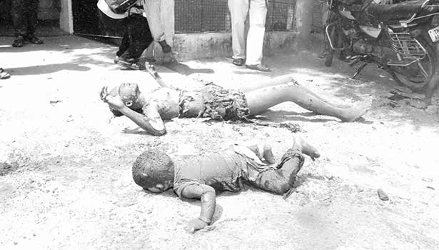 அவர்கள் வலி தாங்க முடியாமல் அலறினர். அவர்கள் மீது தீ கொளுந்து விட்டு எரிந்ததால் அவர்களின் அருகில் யாரும் செல்ல முடியவில்லை. அங்கு நின்ற போலீசார் மண்ணை அள்ளி எரிந்து தீயை அணைக்கும் நடவடிக்கையில் ஈடுபட்டனர்.