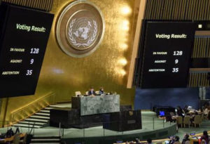 முன்னதாக ஐ.நா. தீர்மானத்தை ஆதரிப்பவர்களுக்கு நிதியுதவி நிறுத்தப்படும் என்று அமெரிக்க அதிபர் டிரம்ப் மிரட்டல் விடுத்து இருந்தார். அதையும் மீறி 128 நாடுகள் ஐ.நா. சபை தீர்மானத்தை வெற்றி அடைய செய்தன என்பது குறிப்பிடத்தக்கது.