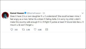 சிறுமி ஆசிபாவுக்கு நிகழ்ந்துள்ள கொடூரம் உங்களுக்கு புரிய அவள் உங்களது மகளாக இருக்க வேண்டுமா? அவள் என்னுடைய மகளாக இருந்திருக்கலாம். ஒரு மனிதனாக எனக்கு மிகுந்த கோபம் வருகிறது. ஒரு தந்தையாக, ஒரு குடிமகனான ஆசிபாவை பாதுகாக்க தவறிவிட்டேன். என்னை மன்னித்துவிடு குழந்தையே, உனக்கான பாதுகாப்பான நாட்டை நாங்கள் உருவாக்க தவறிவிட்டோம். எதிர்காலத்தில் உன்னைப்போல வேறு யாருக்கும் இந்த கொடூரம் நடந்து விடக்கூடாது என்பதற்காக நான் போராடுவேன். உன்னை நினைவு கூர்கிறோம், உன்னை மறக்கவும் மாட்டோம்