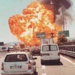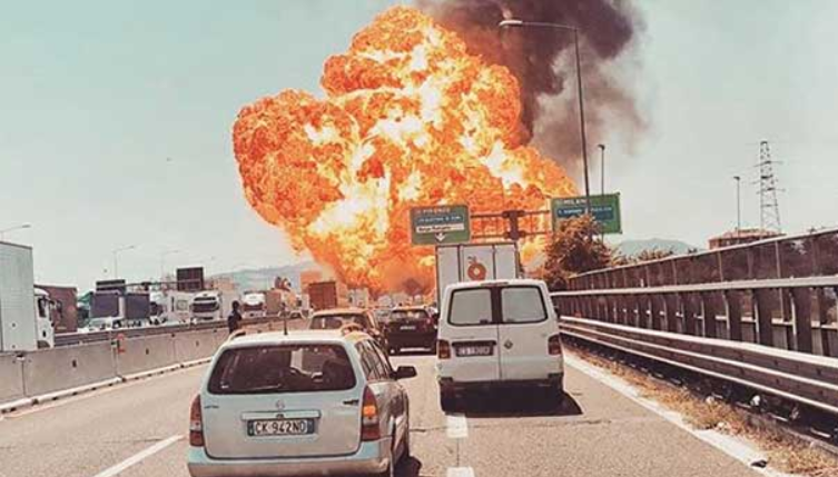 இத்தாலி நாட்டின் போலோக்னா விமான நிலையம் அருகே பாலம் ஒன்றின் மீது கார்களை ஏற்றிக் கொண்டு லாரி ஒன்று சென்றது. அதே பாதையில் தீப்பற்றக்கூடிய பொருட்களை ஏற்றிக் கொண்டு சென்ற டேங்கர் லாரியும் சென்றது. இரண்டு லாரிகளும் ஒன்றுடன் ஒன்று மோதியுள்ளது. இந்த சம்பவத்தில் லாரிகள் வெடித்து சிதறியுள்ளன. இதனால் ஏற்பட்ட தீயானது வான்வரை பரவியது.