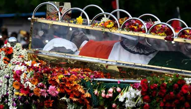 இதைத்தொடர்ந்து அடுத்த சில நிமிடங்களில் பொக்லைன் எந்திரங்கள், ஊழியர்கள் வரவழைக்கப்பட்டனர். குண்டும் குழியுமாக கிடந்த மணல்பரப்பு சமப்படுத்தப்பட்டது. 10 அடி நீளம், 7 அடி அகலம், 6 அடி உயரத்துக்கு செவ்வக வடிவில் பள்ளம் தோண்டப்பட்டு சுற்றுச்சுவர் கட்டப்பட்டது. 4.30 மணிக்கு இந்த பணி முடிவடைந்து சமாதியை சுற்றிலும் சிவப்பு கம்பளம் விரிக்கப்பட்டது.