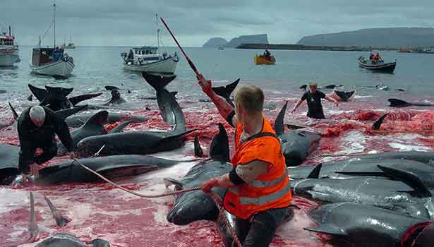 திமிங்கலங்கள் கொல்லப்படுவதால் இதன் உடலில் இருந்து வெளியாகும் ரத்தம் கடலில் கலந்து நீர் சிவப்பாக மாறியது.