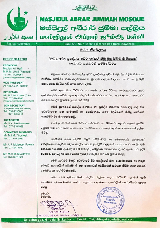 மாவனல்லையிலும் அண்டிய பகுதிகளிலும் இடம்பெற்ற புத்தர் சிலை சேதப்படுத்திய சம்பவம் தொடர்பில் தெல்கஹகொட முஸ்லிம் பள்ளிவாயல் தனது அதிருப்தியை தெரிவித்துள்ளது. பிரதேசத்திலுள்ள முஸ்லிம் – பௌத்த மக்களுக்கிடையில் நீண்ட காலமாக காணப்படும் சமாதானமான உறவையும், சகவாழ்வையும் பாதிக்காத வகையில் இந்த நடவடிக்கைகள் காணப்பட வேண்டும் எனவும் அப்பள்ளிவாயல் நிருவாகம் கேட்டுள்ளது.