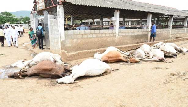 ஆந்திர மாநிலம், விஜயவாடா புறநகர் பகுதியான கோட்டூரு தடையபள்ளியில் உள்ள பசு பாதுகாப்பு இல்லத்தில் (கோசாலை) 1000-க்கும் மேற்பட்ட பசுமாடுகள் உள்ளன. அவற்றில் 100 பசுக்கள் நேற்று திடீரென சுருண்டு விழுந்து இறந்தன. மேலும் 10 பசுக்கள் உயிருக்கு போராடி வருகின்றன.