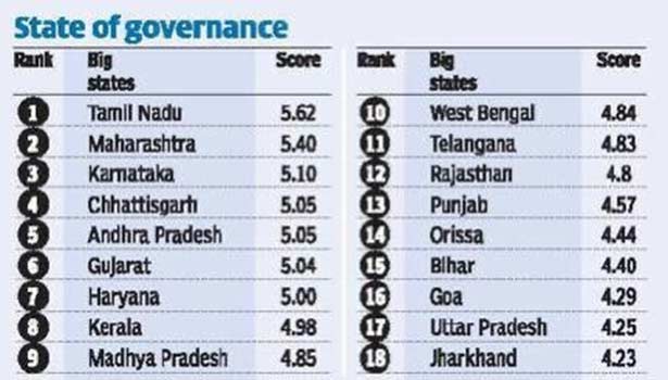 காஷ்மீர், மணிப்பூர், மேகாலயா, நாகலாந்து, அருணாச்சல பிரதேசம் மாநிலங்களில் நிர்வாகம் மோசமாக இருப்பதாக கணிக்கப்பட்டுள்ளது.